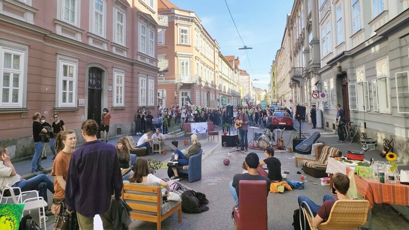 Zum heutigen Auto:Frei:Tag haben Aktivist:innen die Bergmanngasse für den Autoverkehr gesperrt, nämlich im Bereich zwischen der Humboldstraße und der Schröttergasse. Einmal im Monat kommt eine andere Straße dran, nach der Mandellstraße und Merangasse wird heute eine der wichtigstens Ausfahrtsstraßen der Stadt in Beschlag genommen. Die Versammlung wurde ordnungsgemäß bei der Sicherheitsbehörde gemeldet und wird heute bis etwa 22 Uhr andauern. Unter dem Motto: Weihnachtslieder statt Autolärm werden bei der stillen Demo Kekse und Glühwein verkauft - außerdem wird es unter anderem einen Sandspielplatz, einen Fahrradparcours und Livemusik geben. Und Autos müssen draußen bleiben.