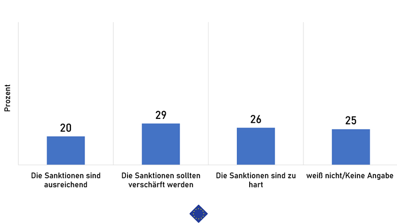 Eine Mehrheit der Österreicher befürwortet laut einer aktuellen Umfrage der Österreichischen Gesellschaft für Europapolitik (ÖGfE) eine einheitliche Linie der EU zur Unterstützung der Ukraine. 29 Prozent der Befragten erklärten, dass die Sanktionen gegen Russland weiter verschärft werden sollten. 20 Prozent halten die bisher von der EU gesetzten Maßnahmen für ausreichend. Etwa ein Viertel (26 Prozent) erachtet die Maßnahmen für zu hart, ein weiteres Viertel ist sich unsicher.